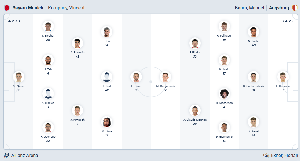 Bayern đang đứng đầu bảng Bundesliga với khoảng cách an toàn với các đội phía sau, họ cũng vừa có chiến thắng tại Champions League để chắc chắn nằm trong top 8 đội mạnh nhất. Phong độ của thầy trò HLV Vincent Kompany cực cao nên việc họ tiếp tục giành chiến thắng là điều được dự báo trước. Việc chỉ phải gặp một Augsburg yếu hơn nhiều càng khiến khả năng giành 3 điểm của Bayern trở nên cao hơn, nhiều khả năng đội bóng chủ nhà sẽ có chiến thắng với tỉ số đậm.