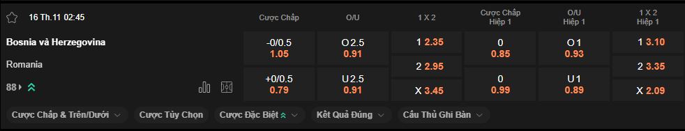 Soi kèo tài xỉu Bosnia vs Romania: 0.84*2.5*0.98