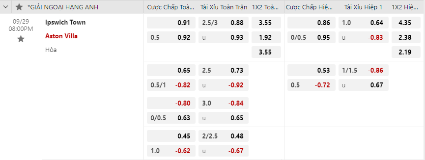 Soi kèo hiệp 1 Ipswich Town vs Aston Villa
