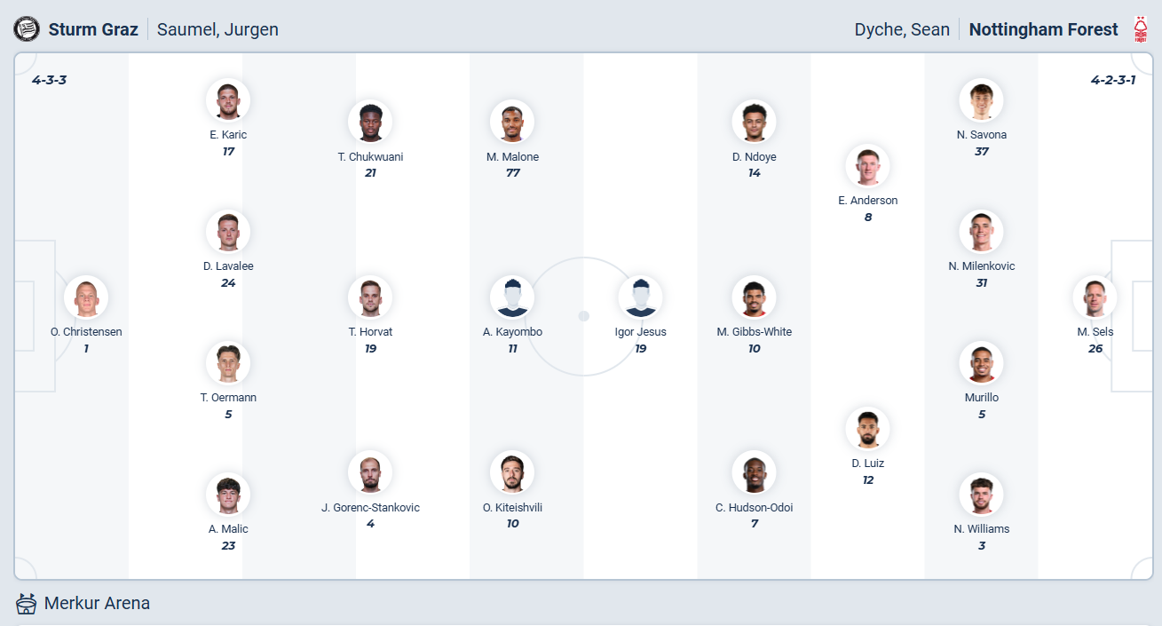 Sturm Graz là đội vô địch quốc gia Áo 2 mùa giải gần nhất, sự trở lại ngoạn mục của đội bóng này sau khoảng thời gian thống trị của Salzburg. Dù vậy tiềm lực của Sturm Graz không cao nên việc rơi xuống Europa League có lẽ hợp hơn với họ. Thực tế cho thấy đội bóng của HLV Jürgen Säumel không hề dễ dàng khi đá các trận đầu tiên tại League Phase, việc họ mới có 3 điểm sau 3 trận cho thấy điều đó. Nguy cơ bị loại rất cao nếu họ không giành kết quả tốt ở các trận đấu sắp tới nên đội bóng nước Áo đặt mục tiêu giành chiến thắng ở lượt đấu thứ tư này. Tuy nhiên trước một Nottingham Forest đang chơi tốt dần lên khi đổi HLV thì khả năng sự cố gắng của Sturm Graz sẽ chỉ giúp họ có được kết quả hòa.